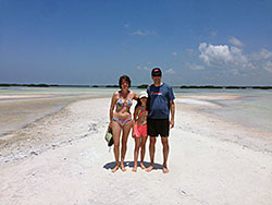 The next morning we drove on to Chiquila from where the boats took off to Holbox Island. Around the harbour one parking lot was next to the other and boys yelled and waved their hands to attract clients to their parking place. We treated ourselves to a private lancha, a fishing boat, which was not a lot faster as promised, but arrived on Holbox at about the same time as the regular boat. On Holbox you get around on foot, by bicycle, golf cart or on an ATV. With our luggage the golf cart was the most convenient method of transportation. We crossed the island on sandy streets to get to our hotel La Palapa de Lino where I had rented a bungalow. The hotel lies on a beautiful beach with deck chairs under coconut palms and the clear blue see directly in front of our noses. There was a small restaurant and a bar, all outdoor of course. We spent the rest of the day in the loungers in the shade of the palm trees, and swimming and swaying in the warm water. Kyra had already good practice keeping her arm and the cast out of the water from our swimming pool, besides there were no waves in these calm waters. Kaspar organized the whale shark tour for the next day. Then we strolled through town and explored the souvenir shops where Kyra quickly learned how to bargain for a better price. Some restaurants looked pretty nice but they all seemed too touristy. Kyra had other plans for dinner. She wanted to have pizza, no discussion. So we sat down at a Pizzeria and ordered two beer while Kyra devoured her Pizza Margarita. Then we went around the corner to a busy taco place with chairs and tables. At the corner we bought a big bottle of beer. The tacos were al pastor, which is somewhat similar to a Greek gyros but the meat is served with a piece of pineapple and spicy salsas, of course. My brother was in heaven with all this spicy food, and Kyra was pleased to see his face turn red because of all the Habanero chiles he had stuffed in his tacos.