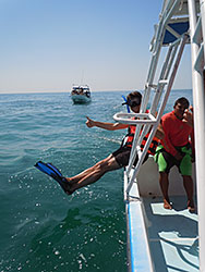 While we were now heading for the position, the first divers were selected. It should definitely be good swimmers. My brother and the other young man were the chosen ones, had to put on flippers and diving masks and were ordered to sit down on the edge of the boat. They were told over and over that they needed to jump into the water as soon as the order was given, and that they had to follow the signs of the assistant all the time. There were a few boats lined up in front of us, and again and again pairs of tourists jumped into the water with their guide. At this time we did not see much of the whale shark. Suddenly it was our turn, the captain yelled "Vamonos!", and off they went. Now we saw the huge contours of the animal and sometimes its fin surfaced. My brother was beaming when he climbed out of the water. Laughing, he told us about the chubby guide who pulled his arm several times pointing towards the whale shark like a maniac, as if one could have overlooked the enormous fish. Now we had to circle around until it was our turn again. I saw a dark shadow in the distance when I jumped into the warm water. We were headed towards this shadow, or better the shadow came swimming towards us. Then I saw this huge mouth in front of me and the whale was slowly gliding by. If it had not been forbidden, I could have easily touched it. That's how close I was. It is difficult to describe the emotions that come over you when you are so close to such an elegant and gentle giant. For a long time, at least that's how it felt, I was able to swim with the animal, admiring the white dots on its dark gray skin. The local fishermen call the animals Domino because of these dots. Then the guide signaled that it was time to go back to the boat. Again, the boat was chugging around in a big circle. Then it was showtime for the non-swimmers. Unbelievable, or perhaps very Mexican, that it was allowed to put non-swimmers into the deep water. In any case, much convincing, and a gentle push from behind, was needed to get mother and daughter into the water. They thrashed the flippers like crazy while the guide grabbed them and tried to pull them as close as possible to the whale shark. These two came out of the water broadly smiling too. This routine continued until everybody had been in the water twice. The group on board tried in vain to convince Kyra to risk the "jump" into the water. The assistant offered to take her on his shoulders so that her cast wouldn't get wet while she could get a good look at the huge creature. A convinced NO! was the answer. Her father offered the same but he too got a negative answer. Perhaps the whale shark was simply too big and too scary for my eleven-year old niece, especially because she couldn't really move around in the water at her own will. Since it had been so beautiful for everybody, my far-travelled brother was allowed to jump in a third time. Then, the captain maneuvered the boat exactly next to the giant creature and we were floating at its side for a while to take pictures. It was surprising that this animal let itself be bothered for such a long time and so patiently by us dwarfs in bright orange life jackets. At least it now had the afternoon to itself until the hustle and bustle started all over again the next morning.