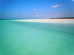 Too soon the fun was over and we got on to the next part of the day. This was a tourist excursion after all, and the people had to be kept happy and entertained, although it would have been perfectly fine with us to snorkel a few more times with the whale shark. The assistant now became the cook, sat down in the back of the boat and started preparing a Ceviche that was later served with tortilla chips. On demand, they even pulled out spicy Habanero chiles. Next, we anchored close to the shore where people could snorkel in the crystal clear water. Unfortunately, the corals were pretty much destroyed by all the boats that anchor here every day, but there were still many colorful fish to be seen - a purple moray hid under a rock, and even a couple of turtles swam about. For the next attraction we drove along mangroves into an elongated, shallow bay where the light blue water was not even knee-deep. Small catfish were already waiting for us, or rather for the leftover Ceviche. Then we were headed back towards Holbox. On the way, we also saw a few flamingos standing in the shallow water although their breeding season was already over. The most fascinating thing about this ride back along the shore was the light turquoise color of the water contrasting beautifully with the dark blue of the sky. In the afternoon we arrived at the pier in Holbox happy, sunburned and exhausted.