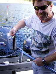 With two permanently-mounted fishing rods we cruise along the tree-trunks that close off the area of the dam. We can see lots of fish on the sonar but none bites. Suddenly after one hour it gets really exciting and the fish bite all together so that we have our hands full of work. One trout is too small, so she goes back into the water where she's picked up like lightning by a seagull. The other trout will later find her way onto our plates. We free her from the hook and hit her head on the edge of the boat. Immediately she stops wriggling. Now it's time for Martin's big moment: He's responsible for threading up the half-worms on the hook. Then everything goes quickly and we decide to roll gently in a certain area along the tree-trunks.