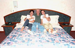 We want to have everything organized for Maggie's arrival late that night in Guadalajara. That's why we drive along the main road out of town near the airport to check all the motels for rooms. The experts on Mexico of course already know what it means when somebody says he stayed in a "motel". These establishments look not unlike a fortress. You pay the portier or the maid. Every room has its own lockable garage. And the price is tempting, only 200 pesos per night (about $20). You'll not get a room in the afternoon, no vacancies! They tell us that we should try again a lot later that night, then we would have a better chance. Slowly it dawns on even the most innocent soul that he landed in a sleazy hotel.. But who cares, the location is perfect. Since we want to spend three nights in Guadalajara, we have to look for another plac to stay. We find a very beautiful bed & breakfast hotel in Tlaquepaque where we're invited for coffee first of all. With the responsible young man we finally negotiate a pretty good deal. We have to spend one night in the hotel which lets rooms by the hour. But the next morning we're already invited to have breakfast at the b&b place and we even get a discount on the price for the rooms. Late at night we're waiting at the airport for the plane from Atlanta which arrives on time. Maggie's one of the first to come through the door, heavily laden with chocolate and other supplies from Switzerland. It's no problem at all to get two rooms in one of the motels at this time of the night. The rooms are huge, but without wardrobe or blankets. The shower is very spacious. A huge mirror hangs opposite the bed and at the head end of the bed is a very practical endless distributor of tissues. You can order and receive pizza, cigars, beer, condoms, and pessaries through a hatch that is accessible from the outside and inside of the room. On the weekend you can have such a room from 11pm for 8 hours. The management kindly grants you one hour more in the morning and so we have to leave the room by 8am. Maids already scurry around with fresh linens. They prepare for another rush of visitors.