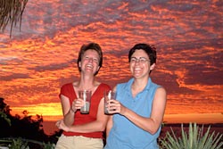 For the next week we rented a little house on the Pacific. The driveway is bizarrely steep and for sure more suited for a Unimog than for a little rental car with 3 persons and a lot of luggage. High above the Bay of Tenacatita and the little fishing village of La Manzanilla we reside like kings. The view over the semicircular sandy bay, the palm groves, and the azure ocean is breathtaking! Every evening we toast with margaritas, perfectly prepared by Martin, to another beautiful sunset. The kitchen is outside, as are the dining tables, but that's very pleasant with the summery temperatures. With enough mosquito repellant even these nasty bugs keep their distance. Instead of watching TV, there's none anyway, we gawk at the white wall where flat geckos hunt for moths. We're especially taken with a praying mantis in form of a brown leaf. She dangles from a pillar and swings like a real leaf in the wind to make herself invisible to us. Screeching parrots and other colorful birds wake us up in the morning. On the weekend we can also be awakened by the stereo which has to be tested for the village fiesta. Our week here flies by with snorkeling, swimming, and long walks along the beach.