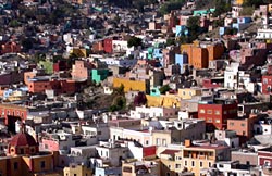 Traffic backups occur only in the narrow streets and especially at night and on weekends. The smoking buses give rise to the wish that the very heart of Guanajuato will be made into a pedestrian area soon. There's a panoramic road around the entire city from which you have many good views of the colorful mass of houses. If you feel like watching tourists, you should go to the statue "Pipilá" that towers high above the city and is easily reached with a small Swiss mountain cableway. The "Jardín" is the best place to sit down and have a beer after strolling around for many hours. Every other minute there's somebody who wants to sell you jewelery, carpets, hammocks, or ponchos, but a wagging finger frees you of the vendors. If you feel like it you can get a group of mariachi singers to your table for about 50 pesos ($5) per song. Our neighbours seem to blow away their month's wages that way, buying beer and tequila, and enjoying themselves enormously with two female tourists who soon sing along with all their heart.
