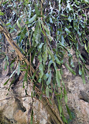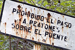 On our way back we hike in the dry river bed for a while. In some parts the sand is still pretty moist and we see clear tracks of different animals. The hoofmark of a deer and the small paws of racoons are easily distinguishable. Then there are bigger paws, either from the vicious dogs people had warned us about, or from a bigger cat, though the former seems more probable. The narrow,m green leaves of an Epiphyllum flow over a big rock. Orchids and Tillandsias are thriving in the trees. Along sunny parts of the cliffs we see a strange bluish cactus with tuberculate ribs, Stenocereus beneckei. Back up at the railroad embankment we make fast progress and soon reach the mouth of the canyon and the spectacular bridge. If one looks down into the depth of the canyon through the wooden beams and the metal structure, even if not suffering from vertigo you can feel quite weak at the knees. The crossing of the bridge is nonetheless a highlight of this hike.