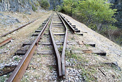 Echeveria grisea is thriving in the crevices and holes of the man-made stone walls near the bridge. Their delicately pink flowers are visited by a tiny hummingbird with emerald green shimmering back, bluegreen breast and a black head with a short beak and a white stripe above the eyes. He follows us for a while, very curious, singing and chattering, but soon he goes back to his usual business of finding food. Just after the bridge we reach the first very short tunnel. Behind it the canyon widens considerably. We follow the tracks for another while but it looks as if we are approaching civilisation again because the railroad embankment had been cleared of rails and was being converted into a dirt road.