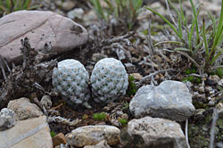 The next day we paid a visit to Mammillaria albiflora. The plants looked like tiny white buttons and were very well camouflaged between the small white pebbles. Then we went on north close to the Cerro Quijay where we looked for Sedum pacense. Almost at the top of the mountain we made a strike and found the plants in bloom. In San Luis de la Paz it was already time to look for a place to have lunch. We did not want to take the risk of eating at a taco place because we wanted Denise to survive the week without suffering from Moctezuma's revenge. The cook took forever to prepare a few quesadillas and a queso fundido, precious time that was later missing for the plant hunting. Past San Luis de la Paz we stopped for Pachyphytum fittkaui and Echeveria elegans but only the untiring Kelly climbed all the way to the top of the cliffs through the thick greenery. Along the winding road down to Xichu we took one detour on a small dirt road but it led only to an old quarry and not as hoped onto the old road which leads along interesting cliffs. The owner of the only decent hotel in Xichu was at mass and so we waited for her on a park bench watching the hustle and bustle in the streets. In the restaurant on the main square they even served almost-vegetarian food for Denise and Kelly and cold beer for everybody. We sat for a long time because while we were having our dinner, rain had started to pour. Usually these downpours don't last long but today we had to run back to the hotel in the pouring rain where we arrived pretty well soaked.