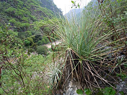All night long the rain was drumming on the roof of the patio of the hotel with small breaks. In the morning gray clouds hung almost below the red roofs of Xichu and it was still drizzling on and off. Opposite the hotel we found a small restaurant where we had coffee, scrambled eggs and quesadillas for breakfast. Denise was well equipped with her own supply of breakfast cereal and nuts, except that even in Mexico City it would probably have been impossible to find the almond milk she liked best. The waitress told us that it had rained for the last four days and nights with short breaks. We had a short discussion about our plans and looked for alternatives on the map but in the end it was decided to continue with the original plan and get going trusting to luck. Past Xichu the muddy dirt road started, leading above the swollen, brownish-red river through a narrow valley that was enclosed by towering cliffs. On this rainy and cloudy morning the sky-high mountains could only be imagined. Soon Kelly had another opportunity for one of his macabre jokes which Denise didn't find funny at all: the road was blocked by a small white pickup truck behind which there was another vehicle blocking more of the road. Kelly cried out "a road block, a road block, we are being assaulted!", but it was only the guy delivering tortillas whose truck had broke down, the same one we had seen earlier at the breakfast place. The first stop was for Echeveria xichuensis and Turbinicarpus alonsoi. Kelly and Julia hiked alone into the small canyon. It was still drizzling and the trees and bushes were glistening with rain drops. Everything was green, full and fat. The plants we were looking for were mostly hidden below completely open selaginellas and difficult to spot. Then we drove slowly along the road to find Calibanus hookeri. It didn't take long until we discovered the first plants far above the road and we finally stopped at a place where one could only just climb up the crumbly rocks. In the meantime it had finally stopped raining and the clouds were higher up. Kelly forgot everything around because of the plants he had never seen before and came back down to the car completely dirty and with muddy shoes. Soon we reached the bridge over the river near Guamuchil. Half of the village had gathered on or near the bridge to see the extremely swollen river with its brownish red water. Some brave boys offered to "wade" through the river if we wanted to take pictures. We kindly declined their offer in the face of the raging waters.