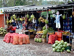 The Mexican highway Mex-200 leads all along the Pacific coast, sometimes through the rolling hills of the interior, sometimes directly along the steep coastal mountains which raise above the yellow sand beaches. We drive through thick jungle, through practically tropical forests on both sides of the road. Huge palm trees, plumerias with little white and fragrant flowers, big red bromelias in the undergrowth, epiphytic orchids of all kinds, lianas and other vines line the road. A strangler fig wrapped its roots around a palm tree of which only the dead straight trunk can still be seen. The land is extremely fertile. If the jungle once is cleared (the forests are burning everywhere to make room for more fields or pastures), the farmers cultivate chiles, tomatos, cucumbers and pumpkins under the coconut palms. Especially in Nayarit you can buy the products of the fruit plantations on fruit stands along the road: freshly picked mangos, bananas on the stem, coconuts, papayas, pineapples, guanabana (sour soap), and other exotic fruits we don't know. The small villages we drive through consist of airy little houses, wooden sheds which are mostly thatched with palm fronds. Colorful flowers bloom in the gardens, chickens peck in the sand, a pig stretches in the shade, barking dogs chase our truck (and pee on the tires as soon as we stop), flamboyant trees are adorned with huge bright red-orange flowers.