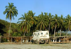 Other beaches, highly recommended by our travel guide "Pacific Mexico" (Moon Handbooks, 2000 edition), are built over with hotels, fine resorts, or simply with private vacation houses or palapa-restaurants. The isolation, the camping for free, the sleepy fishing villages are all long gone and made room for the tourist business. The search for a lonely beach where we can park for free in the first row, where nobody wants to palm you off every few minutes on jewelry, towels, a boat tour, even fish kebabs or fresh (?) oysters, turns out to be difficult. Of course, places like that still exist, but only at the end of bad and dusty roads, known only by the locals. We find such a beach. Huge breakers attracted a Mexican surfer, but apart from a needy dog we're the only human beings here. We can even swim in a protected little cove, a very welcome cooling off from the very summery temperatures that let the clothes stick to the body. At night we toast with a glass of white wine to our find, but soon we learn otherwise. Shortly after sunset when we turn on the lights in our truck, thousands of beetles swarm around us. They are determined to visit us in our comfortable little house. The food is getting cold and the wine warm until we bump all the beetles off. We have to close our windows and "enjoy" our dinner now by the sweat of our brow. Naturally, we're looking again for another beach the next day...