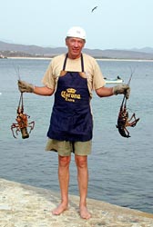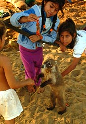 Where the Mex-200 turns inland, we follow dirt roads along the coast. Here there are lonely beaches too, sometimes stretching for miles, sometimes bounded by beautiful rock formations that remind us of the round rocks on the Seychelles. If you look a little closer you can even discover Melocactus curvispinus ssp. dawsonii with tiny pink flowers between the short beach vegetation. The roaring Pacific surf accompanies us day and night. Sometimes we feel the thundering and rushing waves that break on the beach like noise. Here too, Mexican families arrive for the weekend. They stay overnight and make themselves at home in the few palapas. "Pánfilo", a young curious coati came with one of them as a pet, playing with the childern if he doesn't play other pranks. Overnight, he had stolen the cigarettes of his master out of his pockets and chewed them up with relish! Far away from the next paved road we discover a little paradise. Tehualmixtle, simply called Tehua, is a small fishing place with 10 houses and 3 beach restaurants, though the restaurants are not above the beach but at the little harbour. Colorful fishing boats pitch and toss in the totally protected little bay with its quite beautiful sand beach. Every morning a part of the "fleet" disappears and comes back after a few hours with huachinango (red snapper), mojarra (type of sea bream), cazón (shark), but also pulpo (octopus) and langosta (spiny lobster). The oyster-divers bring huge bags of fresh oysters which are immediately opened at the harbour and served to oyster-lovers (to whom we don't count ourselves) in the restaurants. We prefer grilled fish, lukewarm octopus salad or, as a culmination, spiny lobster prepared in our own little house. The little kids find out very quickly that we have a rich fund of sweets with us. The locals greet us very friendly, by now we're part of the little village camping at the harbour mole. There are corals, ferns, sea anemones, and of course many different tropical fish to see around a sunken ship and some rocks. Swarms of little yellow-blue striped fish, practically transparent long pikes, huge swarms of silvery sparkling fish, but also orange ones, dark blue ones with a white bordered feather-like tail fin, and a especially colorful one with blue head, yellow trunk, purple middle section and light blue tail fin, and many, many more colorful fish.