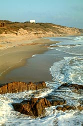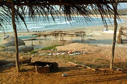 Coming from Guadalajara, we reach the Pacific coast at Melaque. It's a small, run-down place with a few hotels and motels, bungalow complexes in the third row, and umpteen shops that all sell sun tan lotion, beach wear, hats, "refrescos", and of course ice-cold beer. A hotel ruin decays at the beach, old men sit and chat in the shade of some trees, Mexican tourists, mostly middle class families, enjoy the beach with their offspring. That's nothing for us, so we drive a little bit further north.