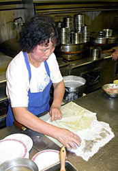 After you've eaten your way through all the delicacies, a visit behind the scenes is appropriate for enthusiastic cooks like us. You can buy frozen Dim Sum in big Asian supermarkets, but this is of course worlds apart from the real stuff. Serious Dim Sum cooks are hard to find and have to be paid a good salary, we learn from our friend. Since he has connections to the scene, he manages to give us access into a Dim Sum kitchen. The owner is out and so the cooks have nothing against us peaking over their shoulders. We can even take pictures. It makes not much sense to ask for recipes though. The information about ingredients and quantity is very vague, the English vocabulary limited, improvisation seems to be the motto. Or you have the craft in your blood! Our cooks are part of a family. The father forms hundreds of little sweets conscientiously and full of love for his work. The mother stands in the front line at the stove and prepares the incoming orders. For example white, quite bland noodles with different stuffings. For this she pours a white mixture of flour and water onto a cloth that lies above a steaming bain-marie. Then she sprinkles dried shrimp, prawns, or seasoned pork meat over it. When everything is thouroughly steamed through she takes the cloth and puts the noodles on an oiled surface. The noodles are rolled up, cut in pieces and served with soy sauce. The son takes care of all the rest and for instance supervises the little aluminum or bamboo baskets in which meat dumplings and dough balls are steamed. Employess come in and ask for more supplies. Of course everything goes off in Chinese and we don't understand one word.