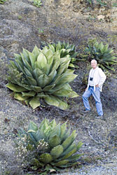 A little further along the road, now in a very moist and shady part of the road, we find other colonies of the same Echeveria. Slowly we chug along. Finally we reach the intersection and there's really a Furcraea martinezii with a large old inflorescence standing just next to the road. We drive uphill for another while but can't find any other plants in the dense forest. Turning around we spot the large purple flowers of an unusual orchid growing right on the top of a huge dead tree. The plant body consists of strange green tubers that are connected through long shoots. Back at the intersection we hike up the mountain a little bit and here, in the shade of large trees, we see many more specimens of this Furcraea that is endemic to these mountains, and all with stems. The plants are an imposing sight with a crown of leaves of about 3 meters (10 feet) in diameter. Between the pine needles young plants that developed from dropped bulbils shoot up like spinach.