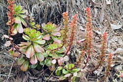 We look in vain for Furcraea martinezii in the gardens of Filo de Caballos. That's the plant for which we came up here. Shortly before reaching Carrizal we finally spot a few small specimens on a shady mountain side. Locals tell us that we could find more and bigger plants at an intersection a few kilometers away. In the village of Carrizal we take a picture of a treelike specimen in a garden. From a loudspeaker emerges the clanging sound of woman's voice announcing that the family of Seņor Fulano, Mister So-and-So, has a phone call. It's probably the relatives calling from the US and since there's only one phone connection in the village, the entire population of the immediate environs of Carrizal knows who and when someone was called on the phone. Before we reach the above-mentioned intersection we're distracted by the bright orange-red flowers of an Echeveria. Echeveria multicaulis is actually only known from the surroundings of Omiltemi but a look at the map is enough to realize that we're only about 16km (10 miles) away from this place as the crow flies. The entrie steep sunny road cut is overgrown by this Echeveria. Unfortunately most plants are completekly covered with dust because of the nearby dirt road. Thanks to their bright orange-red flowers, it was impossible to overlook the plants.