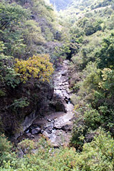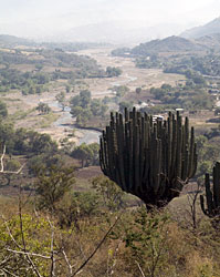 Back on the main highway we come into lower elevations again shortly before reaching Tlapa de Comonfort. Past spectacular cliffs and a dry waterfall we reach the broad valley of the Rio Tlapaneco near Tlapa. At the entrance to town we find the public market where we look around. A small restaurant is packed with policemen, armed to the teeth, and other very dark-skinned market visitors. The food must be really good at this place. A woman prepares huge tortillas that are always served hot with the meal. Soon we manage to grab two chairs and sit down, suspiciously watched by many pairs of eyes. People at the table stare at us without any embarrassment. They must be wondering even more when the two white-skinned visitors from another world start to speak Spanish! The decision for mole poblano, an almost black, thick and spicy sauce, seasoned with chocolate and served with chicken meat, is easy because this dish from Puebla is one of our favorites. Concerning traffic, Tlapa is another chaotic place. We have to take care not to end up in the wrong lane on a one-way street and almost miss the exit our of this hectic small town. Just past Tlapa the valley of the Rio Tlapaneco narrows and a small river, the Rio Salado, flows into the bigger river. With the naked eye we can see Agave petrophila on the vertical cliffs on the other side of the river, but access seems a little bit difficult. Instead, we explore the small canyon of the Rio Salado together with a herd of voracious goats. The bizarre calcareous rock formations at the mouth of the canyon are overgrown with orchids. Hechtias with their barb-like spines stab our pants legs. Here, too, we discover Agave petrophila and the completely unrecognizable stems without rosettes of Thompsonella mixtecana. In the shade of tropical trees, now almost all leafless, we spot a plant, Beaucarnea hiriartiae, that was described only recently. It belongs to the family of the Nolinaceae. With its thick swollen trunk, the slender, snaking branches and the small crowns of leaves it's a very attractive plant. Judging from the healed cuts, it looks like people cut down branches to take them home. We drive on through the narrow canyon of the Rio Tlapaneco and finally reach the bridge over the wide river. Branching roads invite exploratory trips but we drive northward to Acatlan.
